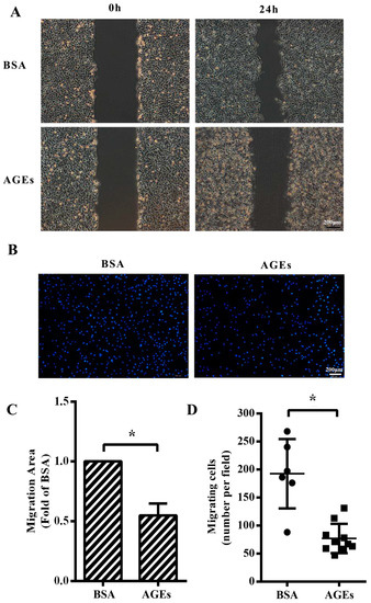 AGEs inhibited the migration of HUVECs. Cells were treated with 100 µg/mL AGEs or 10 µg/mL BSA as control, and incubated with serum-free Dulbecco’s modified Eagle medium (DMEM) for 24 h to inhibit cell proliferation. (A) Cell migration was detected by wound-healing assay; (B) Migrating cells were detected by Hoechst 33342 staining in the transwell assay. Blue dots represented nuclei; (C) Migration area in wound healing assay was quantified using Image J 1.47. Three microscopic fields were randomly selected; (D) Migrating cells in transwell assay were calculated using Image J 1.47. Three microscopic fields were randomly selected. All data were obtained from reproducible experiments (n = 3). * p < 0.05 vs. BSA group.