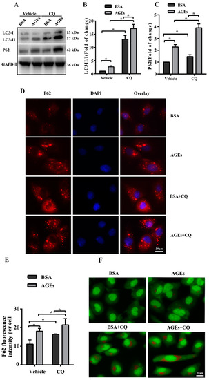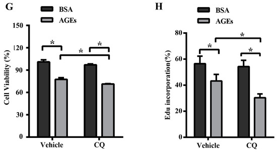 The dynamic change of autophagy contains two aspects: the formation and degradation of autophagosome. When autophagy is induced, microtubule-associated protein 1 light chain 3 (LC3) will transform from the cytoplasmic form (LC3-I) to a membrane-associated form (LC3-II). Therefore, the ratio of LC3-II/I can serve as the primary protein of autophagy [22]. The scaffolding adaptor p62 can connect the LC3 protein to an ubiquitination substrate and can be incorporated into the complete phagosome by final autophagic lysosomal to degradation, marking the completion of autophagic flux [23]. Autophagic flux included the fusion autophagosomes with lysosomes and subsequent degradation of cargo, which was assessed using western blotting to detect the protein expression of LC3 II/I and p62 with and without lysosomal protease inhibitors to block autophagic degradation [24]. In our study, the results of western blotting indicated that AGEs could simultaneously increase the ratio of LC3-II/I as well as p62 in HUVECs (Figure 3A). To better assess the influence of AGEs on autophagy and autophagic flux, we used chloroquine (CQ), an inhibitor of autophagosome degradation, to investigate whether the increased LC3-II/I was because of the induction of early autophagy or because of the inhibition of autophagic degradation. Cells were treated with AGEs (100 µg/mL) and/or CQ (10 µmol/L) for 24 h. As shown in Figure 3A–C, CQ could simultaneously increase the ratio of LC3-II/I and the protein expression of p62 in BSA control group and AGEs-treated group. Consistently, immunofluorescence assay illustrated that AGEs could increase the expression of p62, and CQ could further increase p62 expression in AGEs-treated group (Figure 3D,E). Acridine orange (AO) staining exhibited that AGEs could increase the accumulation of acidic vacuoles in HUVECs, and CQ could further increase the acidic vacuoles in AGEs-treated group (Figure 3F). Overall, these results indicated that AGEs increased the autophagic flux in HUVECs, in accordance with previous studies [25,26]. When autophagic flux was blocked by CQ, the results of MTT assay (Figure 3G) and EdU staining (Figure 3H) indicated that cell viability and proliferation further decreased compared to AGEs-treated group.