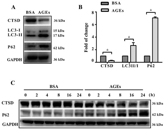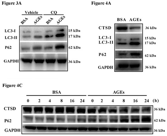 Lysosomes play a crucial role in autophagy, where misfolded proteins and cell debris in autophagic vacuoles could be degraded by lysosomal enzymes. We next aimed to assess whether autophagic flux was associated with lysosomal enzymes. The results of western blotting indicated that the expression of CTSD significantly decreased after treatment with AGEs (Figure 4A,B). Figure 4C–E shows that CTSD reduction coincided with p62 accumulation. CTSD participates directly in autophagy and is responsible for the degradation of autophagosomes [20]. Our results seemed to be contradictory to previous studies.