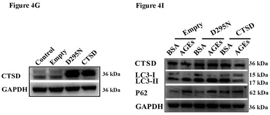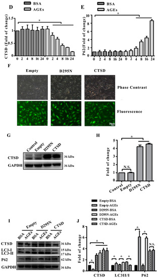 To explore the role of CTSD and its enzyme activity in autophagy induced by AGEs, CTSD was overexpressed in HUVECs using lentiviral vectors labelled with green fluorescent protein (GFP). The GFP-expressing lentiviral plasmids containing wild-type or catalytically inactive mutant (D295N) CTSD complementary deoxyribonucleic acid (cDNA) were transduced into cells, which can express wild-type CTSD protein (with enzyme activity) and mutant CTSD protein (without enzyme activity), respectively [27]. Measurement of GFP positive cells under fluorescence microscopy showed that lentiviral vectors were successfully transduced into cells with transduction efficiency >90% when multiplicity of infection (MOI) was 100 (Figure 4F). Western blotting also confirmed that the lentiviral CTSD construct could significantly increase CTSD expression (Figure 4G,H). Importantly, wild-type CTSD could significantly decrease the ratio of LC 3II/I as well as p62 accumulation induced by AGEs, but D295N CTSD had no such effects (Figure 4I,J), indicating that CTSD overexpression could further promote the degradation of autophagosome and that this effect was related with its enzymatic activity.