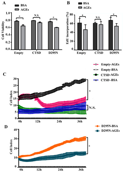 The effects of CTSD on the proliferation of HUVECs. Lentiviral plasmids containing wild-type CTSD or D295N CTSD complementary deoxyribonucleic acid (cDNA) were transduced into cells, which were classified into the CTSD group and D295N group, respectively. Cells with empty vector served as control. (A) Cell viability was detected by MTT; (B) EdU incorporation was quantified using Image J 1.47; (C,D) Cell proliferation was monitored by RTCA dynamically. Cell index was recorded automatically at 15 min intervals and monitored continuously for 36 h. All data were obtained from reproducible experiments (n = 3). * p < 0.05 compared with respective BSA group. N.S., no statistical significance.