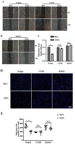 The effects of CTSD on the migration of HUVECs. Lentiviral plasmids containing wild-type CTSD or D295N CTSD cDNA were transduced into cells, which were classified into the CTSD group and D295N group, respectively. Cells with empty vector served as control. Cells were treated with 100 µg/mL AGEs or 10 µg/mL BSA as control, and incubated with serum-free DMEM for 24 h to inhibit cell proliferation. (A,B) Cell migration was analyzed by wound-healing assay; (C) The migration area was quantified by Image J 1.47, normalized by BSA group (* p < 0.05 vs. BSA + empty group. N.S., no statistical significance.). Three microscopic fields were randomly selected; (D) Cell migration was also analyzed by Hoechst 33342 staining in the transwell assay. Blue dots represented nuclei. Three microscopic fields were randomly selected; (E) Migrating cells were counted under microscopy (* p < 0.05 vs. BSA + empty group. N.S., no statistical significance.). All data were obtained from reproducible experiments (n = 3).