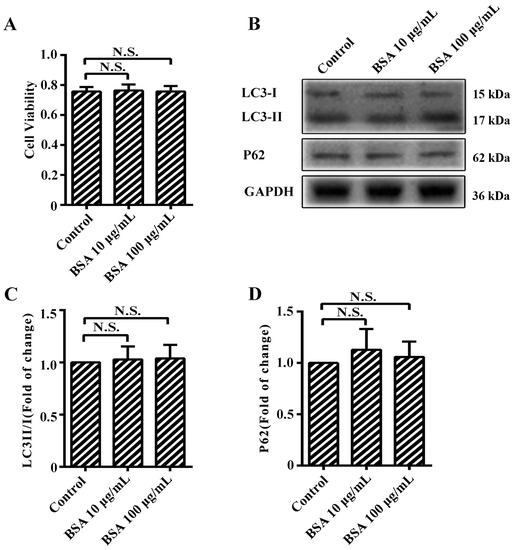The effect of 100 µg/mL BSA on cell viability and autophagy. (A) Cell viability was detected by methyl thiazolyl tetrazolium (MTT) assay; (B) The protein expression of microtubule-associated protein 1 light chain 3 (LC3)-II, LC3-I, and p62 were analyzed using western blotting, and glyceraldehyde 3-phosphate dehydrogenase (GAPDH) was used as a control; (C,D) The band intensity was quantified using Image J 1.47, normalized by GAPDH. * p < 0.05 compared with control group. N.S., no statistical significance.