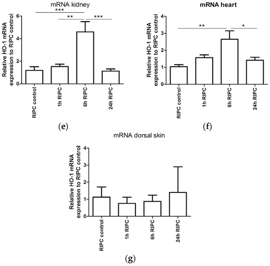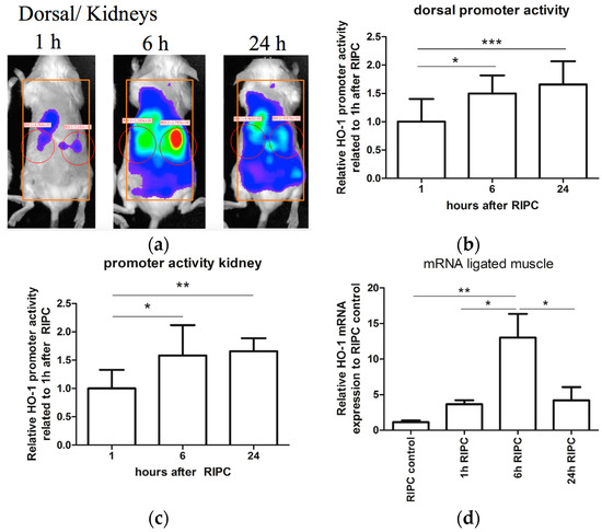 RIPC can induce HO-1 expression in different organs. In order to evaluate if RIPC can induce HO-1 expression, we used a combination of HO-1 promoter activity and HO-1 mRNA analyses in HO-1-luc transgenic (Tg) mice. We previously demonstrated that treatment with cadmium chloride (CdCl2) potently induced HO-1 promoter activity in the liver and kidney using the HO-1-luc Tg model [49]. To validate the RIPC model, we corroborated that blood flow was indeed hampered after applying elastic rings (Figure A1). After RIPC treatment, HO-1 promoter activity was measured using the In Vivo Imaging System at 1, 6, and 24 h. Measurements of HO-1 promoter activity were acquired at the dorsal aspect of each mouse (Figure 1a). Because of variations in HO-1 promoter activity, each mouse served as its own control. Relative HO-1 promoter activity of the dorsal side of the mice after RIPC treatment is shown over time (Figure 1b). We found a significant increase in HO-1 promoter activity after 6 and 24 h of RIPC treatment compared to 1 h after RIPC. HO-1 promoter activity was strongly observed in the renal area, suggesting RIPC induced HO-1 promoter activity in an organ-specific manner 6 and 24 h after RIPC treatment when compared to 1 h after RIPC treatment (Figure 1c).