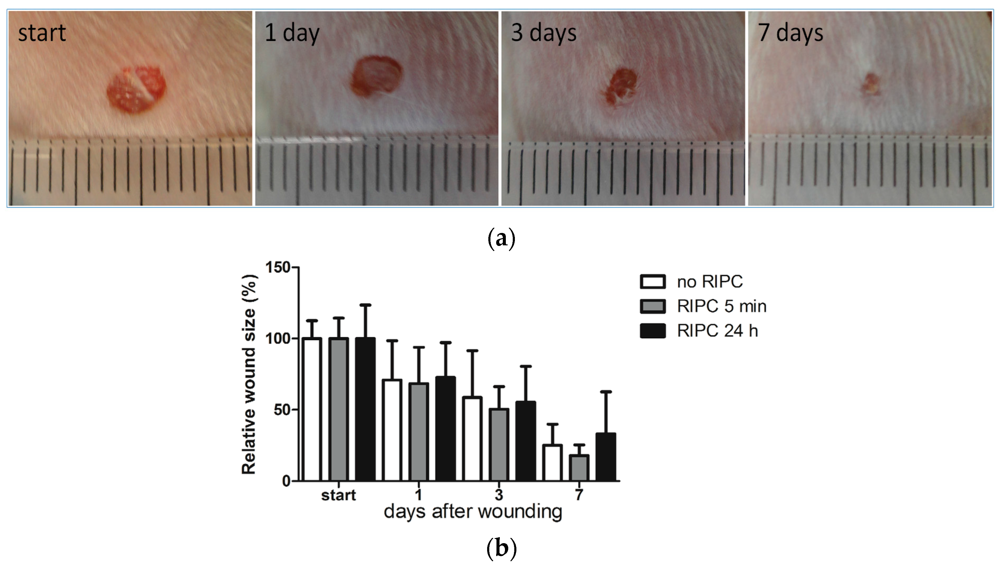 Excisional wound closure in time after RIPC treatment 24 h and directly after wounding compared to the control group. Representative images of the wounds of a single mouse receiving no RIPC treatment at day 0, and at 1, 3, and 7 days after wounding (ruler is incorporated in the pictures and each bar represent 1 mm) (a) and their relative wound sizes after different treatments in time, compared to control group at day 0 (b). Data are expressed as mean ± SD. No significant differences were observed between the different groups: no RIPC (n = 8), RIPC 5 min (n = 6) and RIPC 24 h (n = 6).