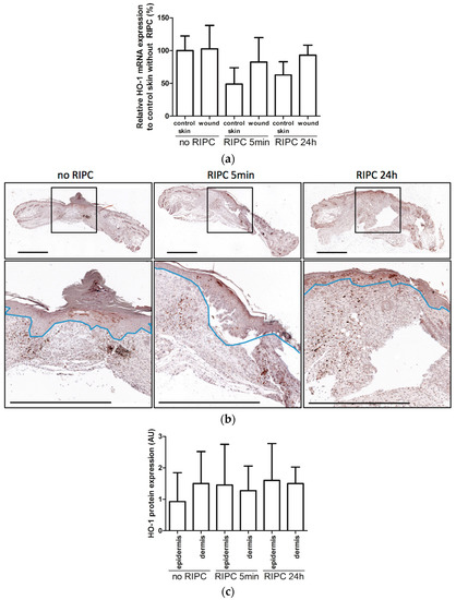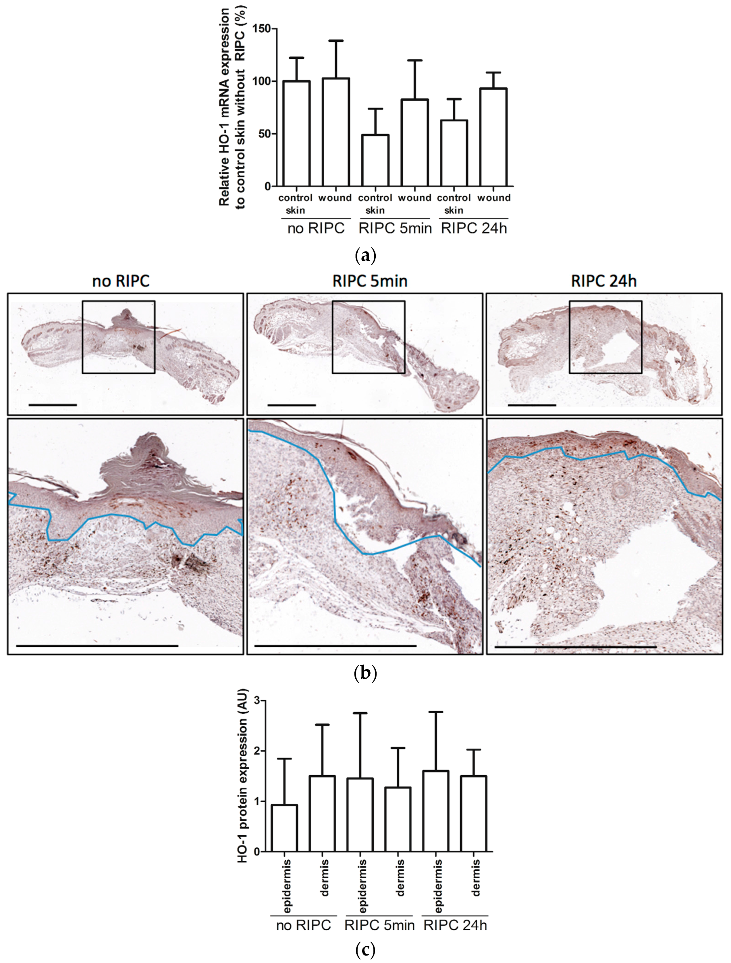 HO-1 expression in wounds. (a). HO-1 mRNA expression in unwounded (control) skin at day 0 and wounds after 7 days for the different treatments compared to control skin; (b) HO-1 protein expression in control, and early and late RIPC-treated wounds after 7 days of healing. Region above the marked blue line is the epidermis and underneath the blue line is the dermal layer (bars represent 1 mm); (c) Scored HO-1 protein staining in epidermis and dermis of the wounds after 7 days in arbitrary units (AU). Data are expressed as mean ± SD. No significant differences were observed between the different groups: no RIPC (n = 8), RIPC 5 min (n = 6) and RIPC 24 h (n = 6).