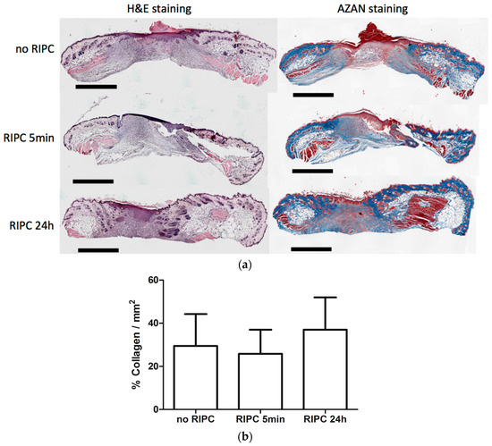 Effects of early and late RIPC on morphology of 7-day-old excisional wounds. (a) H&E and AZAN staining were performed to evaluate wound morphology (bars represent 1 mm); (b) Quantification of collagen deposition to assess the level of wound remodeling using AZAN staining. Data are expressed as mean ± SD. No significant differences were observed between the different groups: no RIPC (n = 8), RIPC 5 min (n = 6) and RIPC 24 h (n = 6).