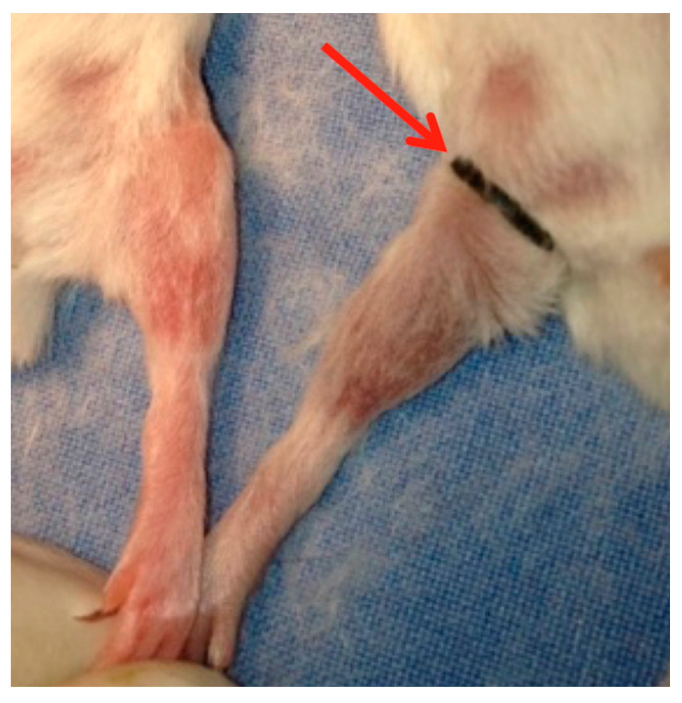 Hind limb ischemia by ligation using elastic ring (red arrow). Note the difference in the color of the legs after obstruction of the blood flow, confirming RIPC treatment was successful.