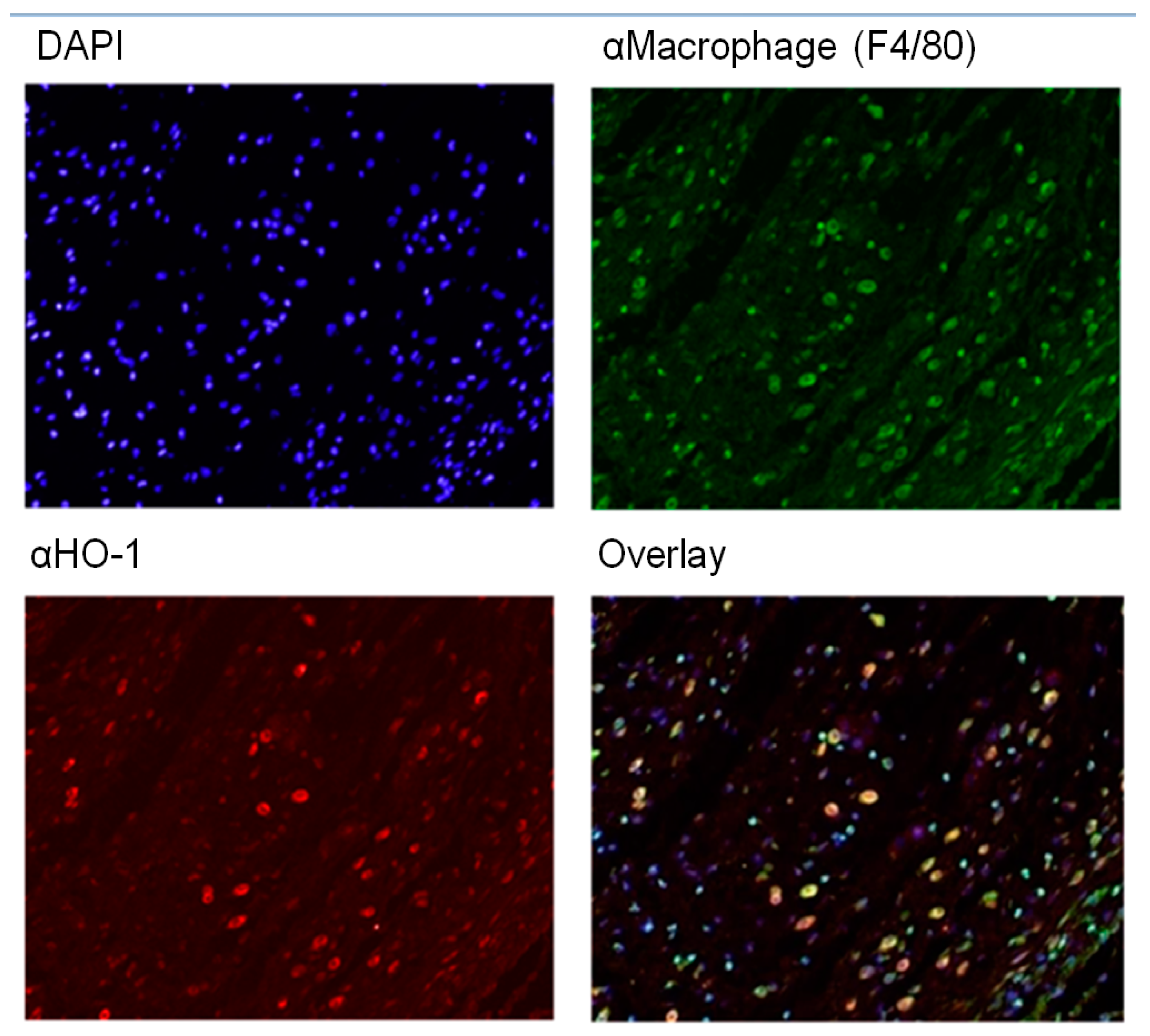 Co-localization of HO-1 and macrophages during excisional wound healing. Fluorescent staining from a previous experiment on excisional wound healing in C57Bl/6 mice at day 2 post wounding, showing cell nuclei stained with DAPI (blue), HO-1 (red), macrophages stained for F4/80 (green), and an overlay. The overlay picture clearly shows co-localization (orange) of HO-1 and macrophages.