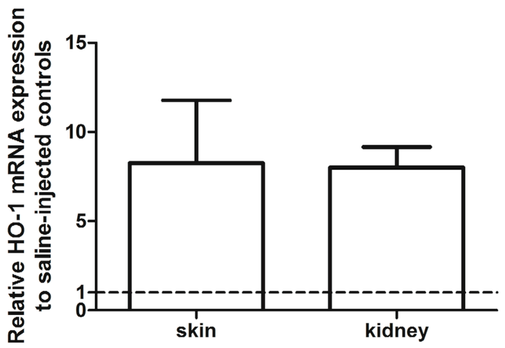 Pharmacological preconditioning with cobalt protoporphyrin (25 mg/kg body weight) in HO-1 luc Tg mice (n = 6) induced HO-1 mRNA expression in both the skin and kidney 24 h after treatment when compared to saline-injected control mice (n = 6). Dashed line represents the mRNA expression levels in the corresponding control organs after saline injection, which are set at 1. Data represents the relative mean ± SD. One significant outlier was found in both skin and kidney group and therefore excluded in the graph.
