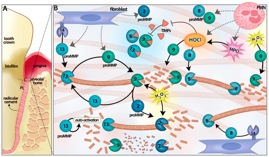 Matrix metalloproteinase (MMP) activation cascades in connective tissue catabolism during periodontitis. Full and partial circles with their respective number represent latent and activated specific MMPs. Brown T bars represent collagen fibers. (A) Tooth and its supporting structures: radicular cement, periodontal ligament (PL) and alveolar bone; (B) Membrane bounded MMP-14 activates proMMP-13 to degrade type I collagen, which constitutes the bulk component of radicular cement, periodontal ligament (PL) and alveolar bone extracellular matrix; MMP-13 activates proMMP-9, which in turn might activate proMMP-2 and proMMP-13. MMP-2 and MMP-9 further process gelatin resulting from collagenase activity. MMP-13 can undergo auto-activation by self-proteolysis. Reactive oxygen species, such as HOCl and H2O2, from phagocytes can also modify the proteases/anti-proteases balance, activating latent MMPs and inactivating the tissue inhibitor of MMPs (TIMP)-1. MPO, myeloperoxidase.