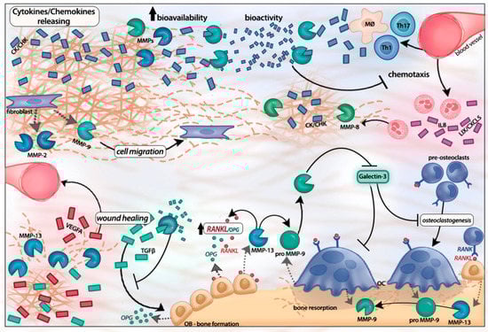 The persistent secretion of pro inflammatory Th1 cytokines in the periodontal tissues, such as tumor necrosis factor alpha (TNFα), interleukin (IL)-1β, IL-6, IL-12, and interferon gamma (IFN-γ); Th17 cytokines, such as interleukin IL-17, together with low levels of regulatory cytokines (Treg), such as IL-10, and transforming growth factor beta 1 (TGF-β1), has been associated with continued inflammation and the destruction of the supporting structures of teeth [61]. Similarly, the relative abundance of chemokines favoring the infiltration of neutrophils (e.g., CXC motif chemokine ligand 8, a.k.a. CXCL8), macrophages (e.g., CC motif chemokine ligand 2, a.k.a. CCL2), and Th1/Th17 lymphocytes (e.g., CC motif chemokine ligand 20, a.k.a. CCL20) has been associated with the inflammatory destruction of periodontal tissues. Notably, most of the former signaling molecules are targets for MMP cleavage and hence their biological activity could be regulated by MMPs [62].