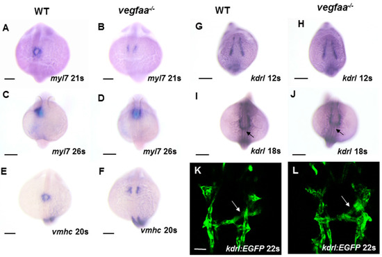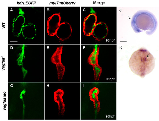 Several studies have proven that vascular endothelial growth factor A (Vegfa) plays a crucial role in vascular development; however, a detailed examination of its function in cardiogenesis has not yet been conducted. The heart region in heterozygous VEGF-deficient mice (VEGF+/−) displayed atrium and ventricle developmental delay and decreased thickness of the ventricle wall [5]. VEGF+/− is embryonically lethal due to severe vascular anomalies that lose the chance to generate homozygous-deficiency model for in vivo study [5,6].
