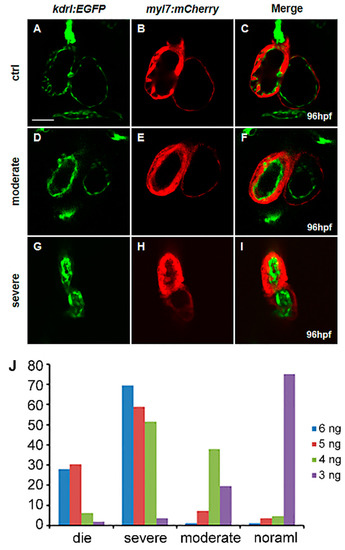 The majority of the embryos display normal heart development (42/56) or moderate defects (11/56) with 3 ng MO doses. With a slight increase in the dose of MO to 4 ng, approximately half of the morphants show severe defects (34/66) and a proportion with moderate malformation (25/66). The heart phenotypes are severe as the dose is increased up to 5 ng MOs (17/56 embryonic death, and 33/56 severe defects), while most of embryos are dead (23/82) or display severe defects (57/82) when 6 ng vegfaa MOs is administered. These results show that cardiac development in zebrafish is extremely sensitive to Vegfa dose and in a stringent dose-dependent manner.