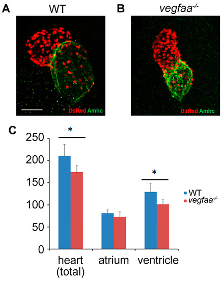 vegfaa promotes cardiomyocytes proliferation. (A,B) Immunofluorescence indicates the expression of transgene Tg(myl7:nDsRed) (red) in both cardiac chambers facilitating cardiomyocyte counting at 48 hpf. Atria are labeled with the anti-Amhc (atrial myosin heavy chain) antibody S46 (green); (C) Bar graphs indicate the number of atrial and ventricular cardiomyocyte nuclei, as well as the total number of cardiomyocytes; asterisks indicate statistically significant differences compared to wild-type (p < 0.05) (WT n = 5; vegfaa−/− n = 5).