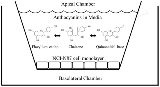 The human stomach is subject to a wide range of pH levels, depending on an individual’s fed or fasted state, and can vary between individuals as well. Thus, any discussion of uptake or transport of compounds by the stomach must take into account its ever-changing environment. The NCI-N87 cell line provided a novel tool as an in vitro model to simulate the changing pH environment of the stomach. Environmental pH is known to have profound effects on the chemistry of anthocyanins in solution, and this work showed that pH also had a significant impact on the transport and uptake of anthocyanins by NCI-N87 cells. The flavylium cation, predominant in acidic pH, appeared to have been more preferentially taken up and transported by this cell line. While the chalcone form of the anthocyanin, with its open-ring structure, was generally less favorably transported by the cells. However, high concentrations of anthocyanins yielded similar cellular uptakes between pH 3.0 and 5.0, which was perhaps related to anthocyanin chemistry or an additional method of transport.