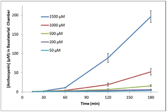 Anthocyanins were detected in the basolateral chamber in 15 min with initial concentrations >200 µM (1.0 and 1.4 µM anthocyanin concentrations detected for 500 and 1500 µM initial concentrations, respectively). However, anthocyanins were not detected in the basolateral chamber at 15 min with the initial concentration of 50 µM. At 120 min, significant differences in the anthocyanin concentrations in the basolateral chamber anthocyanin concentrations were found between 1500, 1000, and 500 µM treatment concentrations, respectively, with 88.7 > 19.2 > 6.4 µM detected (p < 0.05). At 180 min, significant differences were observed between all initial concentrations: 3.7, 6.2, 16.2, 52.6, and 196.2 µM in the basolateral chamber at 50, 200, 500, 1000, and 1500 µM initial concentration, respectively (p < 0.05). The concentration of anthocyanins transported from the apical to basolateral chamber increased over time (see Figure 2).