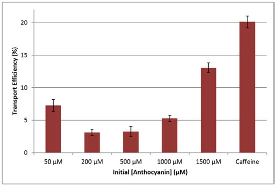 At 50 µM initial anthocyanin concentration, uptake efficiency was higher than that observed at 200, 500, and 1000 µM. Highest uptake efficiency was observed at 1500 µM (p < 0.05). Despite the large standard deviation associated with the 50 µM uptake efficiency due to extremely low anthocyanin amounts and the limits of detection of the instruments, efficiency was still calculated to be significantly higher (0.41%) than the uptake efficiencies for 200, 500, and 1000 µM (0.17%, 0.14%, and 0.14%, respectively). Interestingly, the uptake efficiency at 1500 µM (0.25%) was not significantly different than that of 50 µM. Anthocyanin uptake efficiency exhibited similar trends as transport efficiency, and neither followed linear dose-dependent responses.