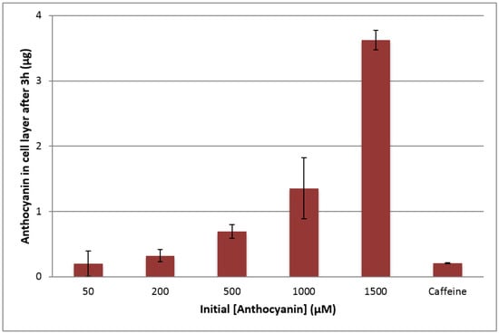 The amounts of anthocyanins taken up by the cells were also analyzed by collecting the cell layers after treatment. More anthocyanins were extracted from the cells with each increase in the initial concentration of 50, 200, 500, 1000, and 1500 µM (see Figure 4), significantly increasing with each increase in initial anthocyanin concentration (p < 0.05). With low initial 50 µM anthocyanin concentration treatments, anthocyanins were not always detected in cells for every treatment replicate, accounting for the large standard deviation of this data set. Caffeine was again used as a control for passive diffusion through the gastric monolayer; it is not necessarily taken up or metabolized by gastric cells []. Despite the high initial concentration of caffeine (1500 µM), the amount of caffeine extracted from the cells was relatively low, and was statistically similar to the initial anthocyanin concentration of 50 µM.