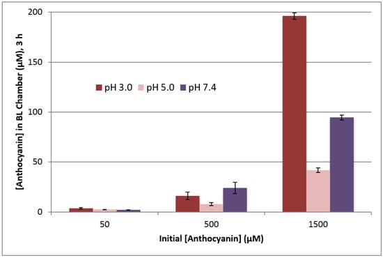 Anthocyanin concentrations (µM) collected from basolateral chambers with varying apical pH values after 3 h treatment at 37 °C.