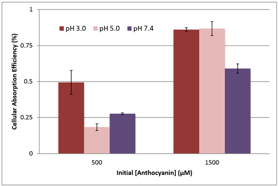 Effects of apical pH on the cellular anthocyanin uptake efficiency (%) of NCI-N87 cells after 3 h treatment at 37 °C and basolateral pH 7.4. Uptake efficiency was calculated as (Concentration extracted from cell layer/Initial treatment concentration) × 100.