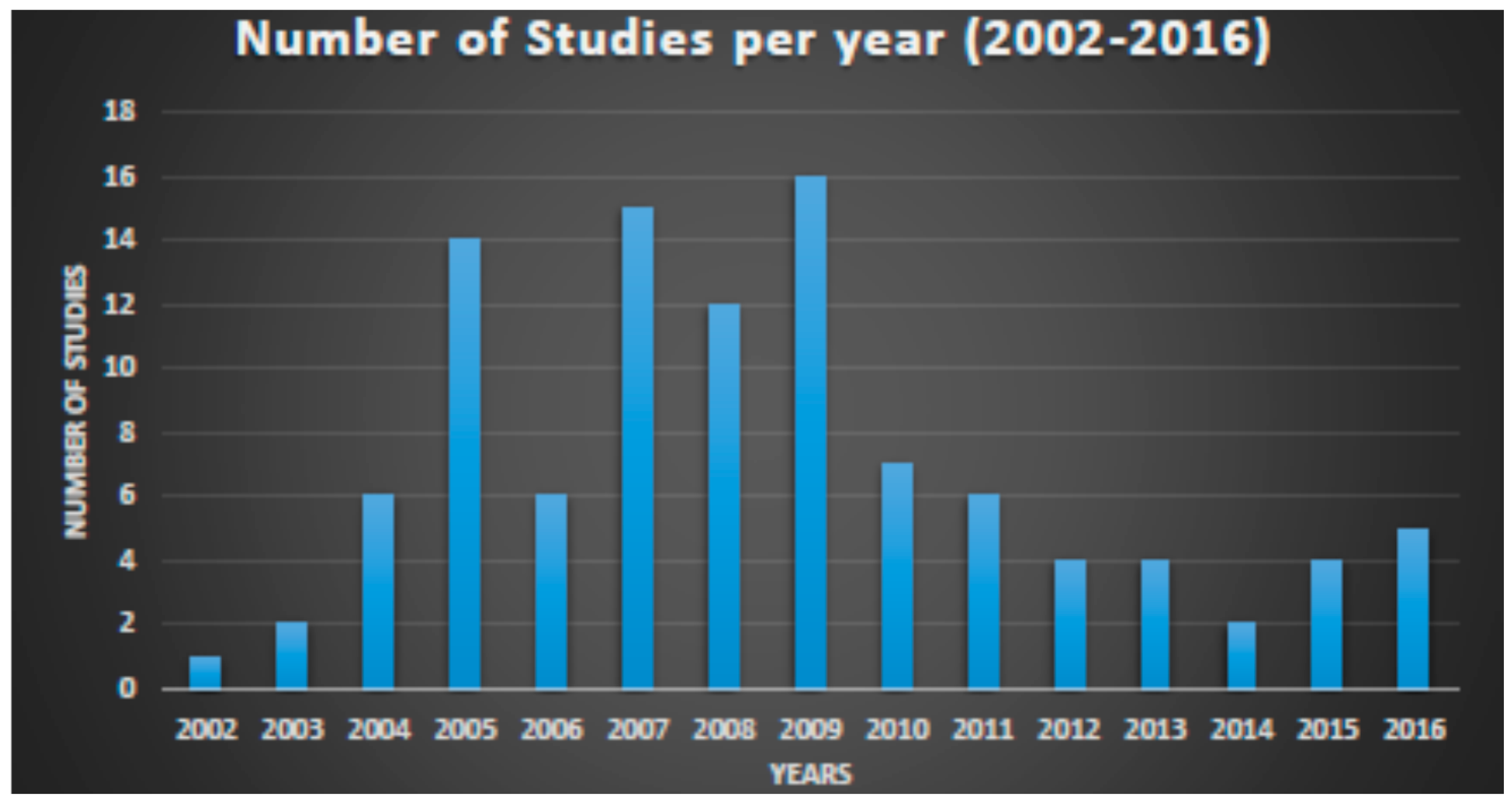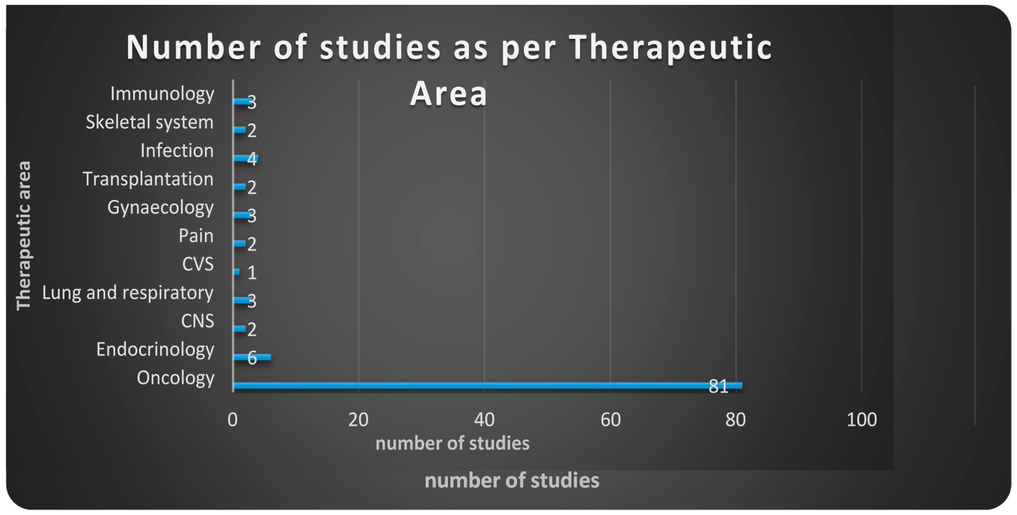 Clinicaltrials.gov database Analyses (Table A, Supplementary Materials). From 123 search results a total of 109 were identified as early-phase studies with proteomic biomarkers as one of the outcomes. This represents 0.14% of the 76,188 early-phase interventional studies in the database. First use of proteomics in early-phase studies was noted in 2002. Over the past 14 years there has been initially a gradual increase in pharmacoproteomic early-phase studies followed by a decrease after 2009 (Figure 1). The majority of studies (77; 71%) were conducted by academic institutions (17; 15%) were conducted by industry, and (15; 14%) were industry-academia collaborations (Figure 2). Oncology was the most common therapeutic area in more than 80% of studies. Other therapeutic areas with less than seven studies each were endocrinology, gynecology, respiratory, immunology, transplantation, cardiovascular, central nervous system, infectious diseases, skeletal system and pain (Figure 3).