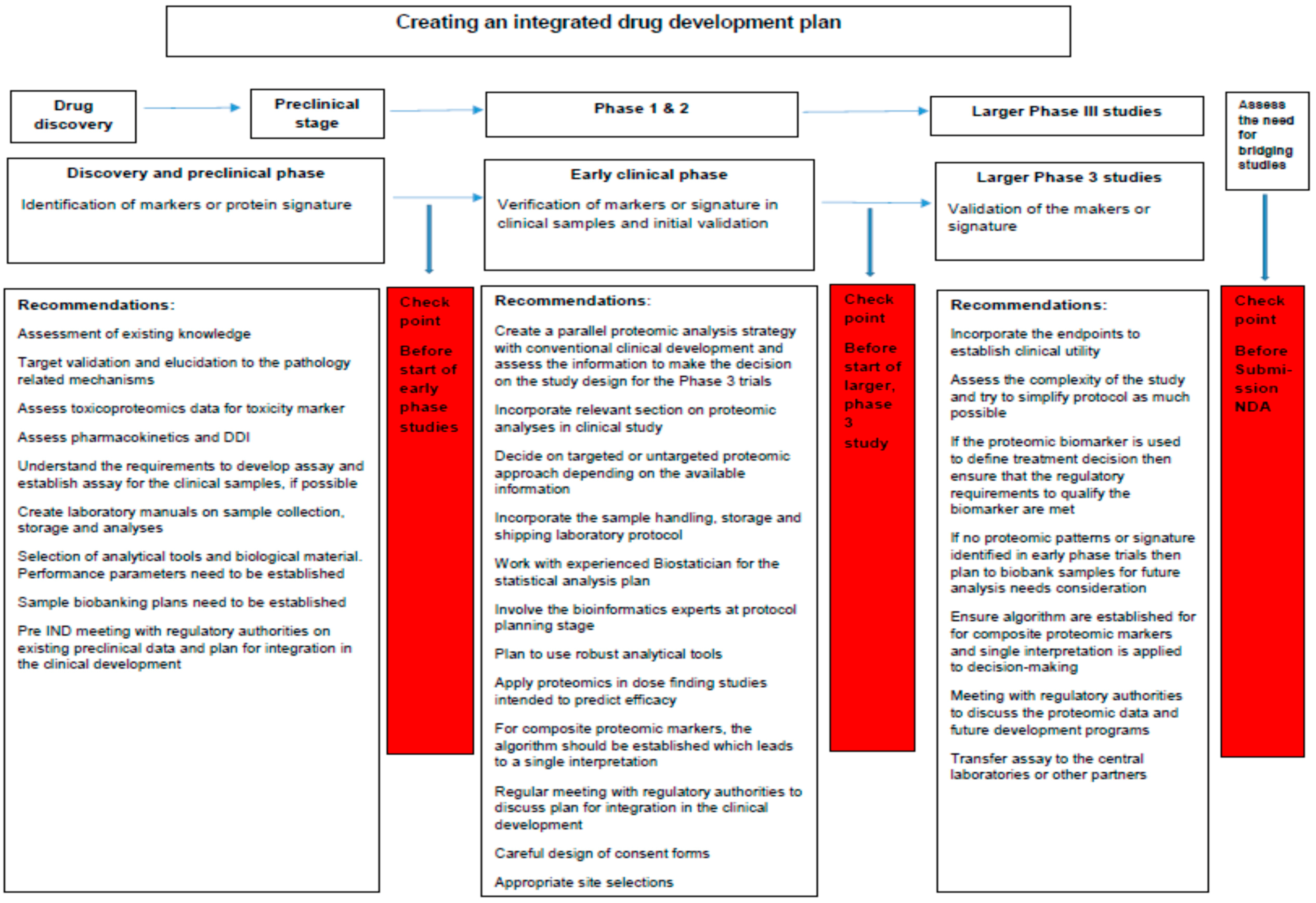 Involvement of various stakeholders including basic scientists, statisticians, bioinformatics, analytic experts, clinical researchers, regulatory authorities and patient advocates will ensure optimal planning, execution, and interpretation of proteomic data. It is important to have the appropriate study design. In phase 1 studies, application of pharmacoproteomics is done in open label dose finding studies where proteomic biomarkers could either be used as an exploratory or secondary endpoint depending on the existing pre-clinical data and degree of biomarker development and validation. Innovative trial designs have been utilized in the omics field and could be applied for proteomics too [85]. Phase 2 studies should be able to guide the study design and assist with informed decision making on conduct of phase 3 studies example whether biomarker enrichment or stratified design should be implemented, if biomarker strategy should not be involved, or if phase 3 is not required at all.