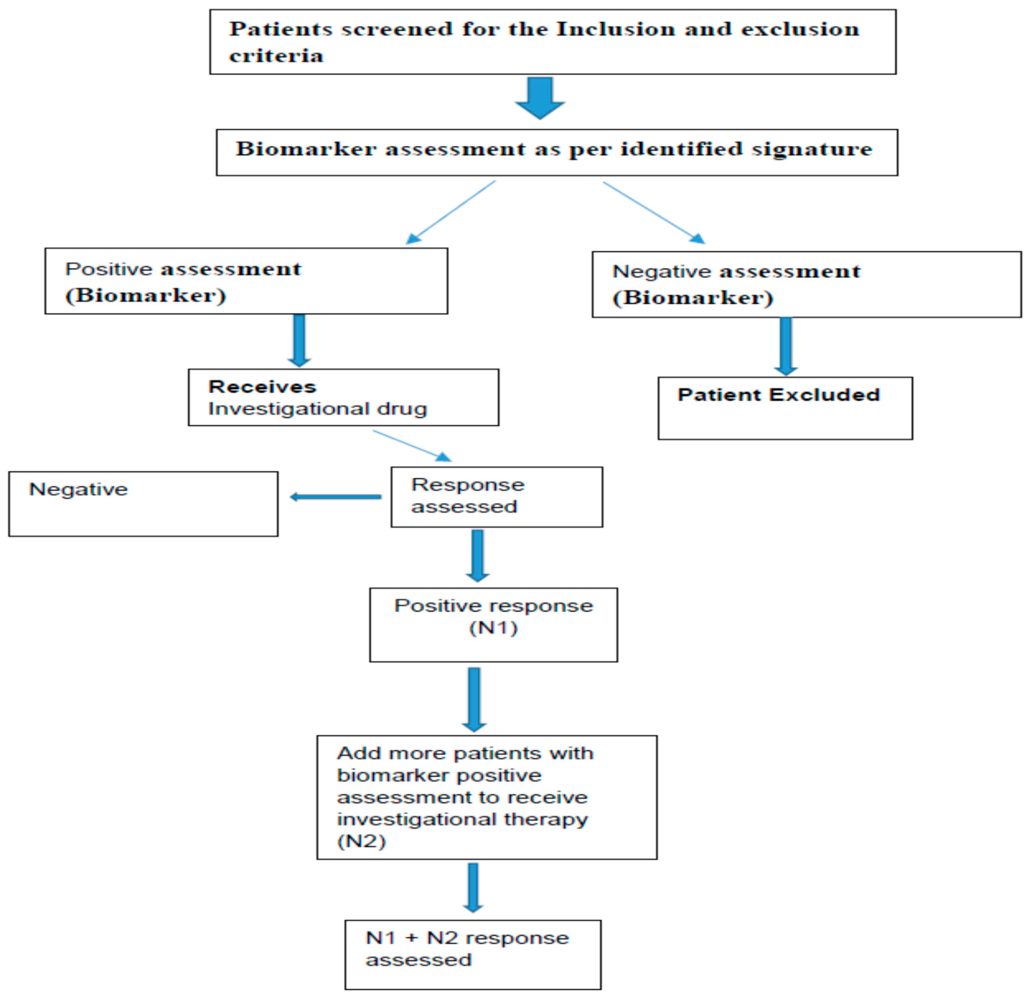 The study designs, which are commonly used for the phase II are generally open label biomarker enriched designs [86,87,88]. Examples schematically shown in Figure 5 and Figure 6. There are many other designs like adaptive parallel two stage design, Phase 2 with randomization, Phase I/II adaptive design, Phase II/III adaptive designs and prospective-retrospective design [88,89].