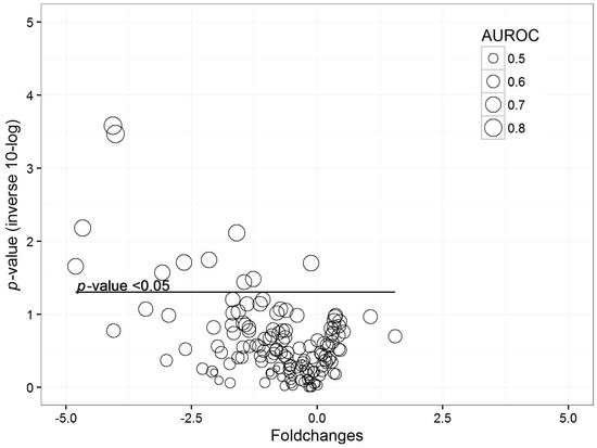 Wilcoxon sum-rank tests were used to identify the VOCs that were significantly different between cases and controls. p values below 0.05 were considered to be statistically significant. Furthermore, fold changes between cases and controls were calculated. Area under the receiver operating characteristic curve (AUROC) was calculated with the pROC package in the R environment [46].