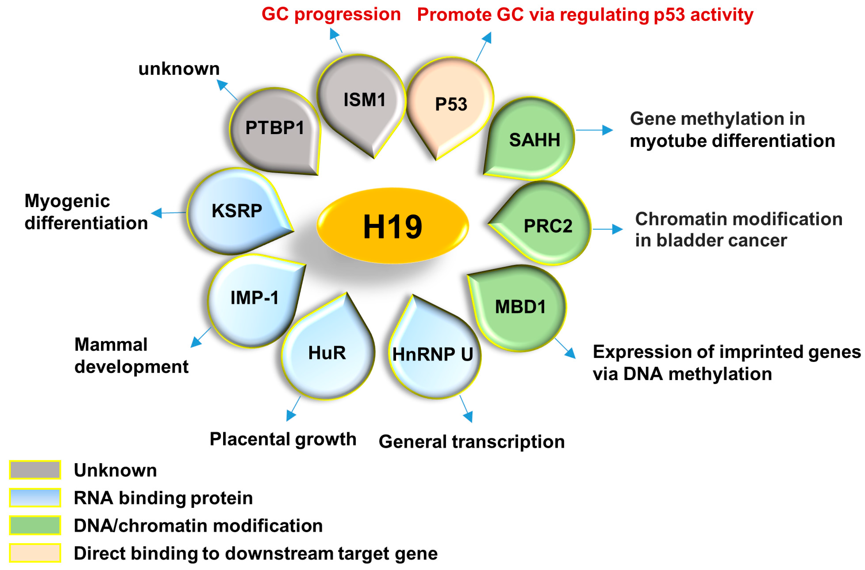 PTBP1, another RNA binding protein regulating RNA metabolism, is also one of the H19 interactive proteins identified by UV-crosslinking [43]. However, the function of H19-PTBP1 is still unknown.