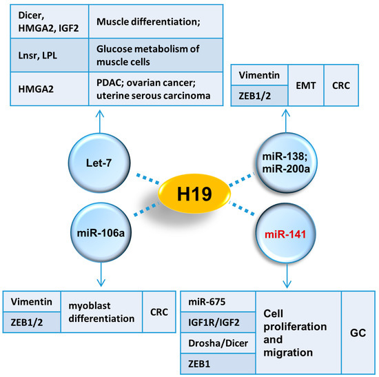 H19/let-7 axis functioned as an oncogene in some tumors. For example, H19 promoted invasion and migration of pancreatic ductal adenocarcinoma (PDAC) cells via stopping let-7 from targeting HMGA2 [85]. With the similar molecular mechanism, H19 increased metastatic ability of pancreatic cancer as well as ovarian cancer and uterine serous carcinoma cells.