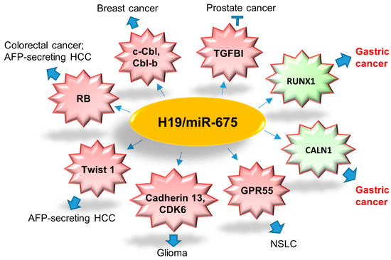 Summary of direct targets of H19/miR-675 axis in different cancer types. H19/miR-675 suppresses prostate cancer metastasis via decreasing TGFB1; enhances tumorigenesis and metastasis of breast cancer by downregulating c-Cbl and Cbl-b; promotes colorectal cancer via decreasing tumor suppressor, RB; mediates AFP-secreting HCC as oncogene via decreasing RB and Twist 1; increases tumorigenesis potential of glioma via targeting Cadherin 13 and CDK6; modulates NSCLC development as a tumor suppressor via targeting GPR55; promotes gastric tumorigenesis through targeting RUNX1 and CALN1. RB, retinoblastoma protein; HCC, hepatocellular carcinoma; NSCLC, non-small cell lung carcinoma.