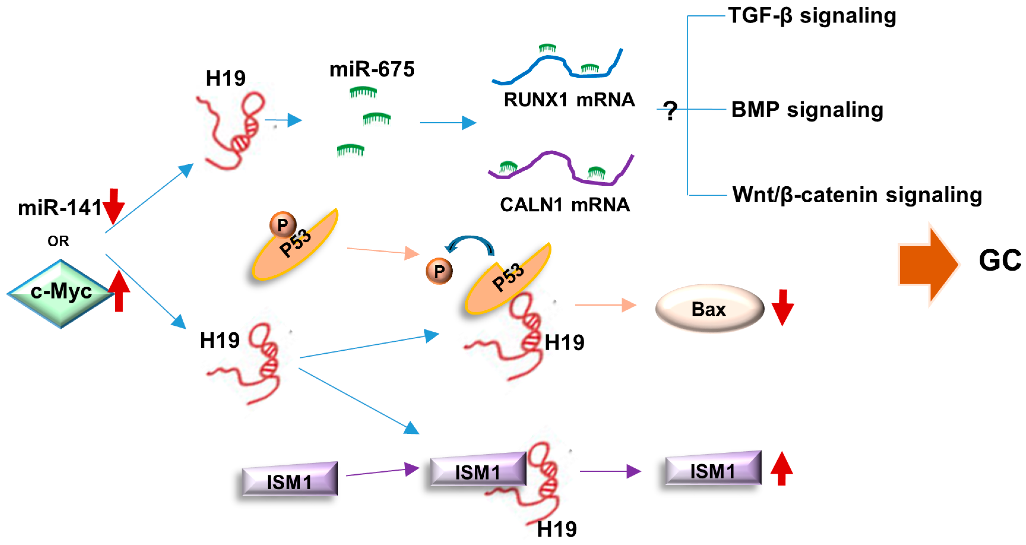 Summary of molecular mechanisms of H19 in GC development. On the one hand, miR-675 derived from H19 can target and degrade RUNX1 and CALN1 mRNA to enhance GC development via influencing potential signaling pathways. On the other hand, H19 binds with p53 to inhibit its activity and decrease BAX. H19 can also bind to ISM1 to induce ISM1 stabilization. The downregulation of miR-141 and c-Myc activation can up-regulate H19 expression in gastric tumorigenesis. GC, gastric cancer; up arrow, upregulation; down arrow, downregulation.