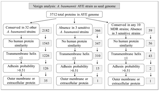 The final calculated results of the Vaxign pipeline execution were visualized using the Vaxign web program. The Vaxign filtering program was also used to identify proteins that met pre-defined criteria. The Vaxign results were also downloaded to an Excel file and separately analyzed. The Vaxign RV analysis results of the 33 A. baumannii genomes are available openly on the Vaxign web page (Available online: http://www.violinet.org/vaxign) for free exploration.