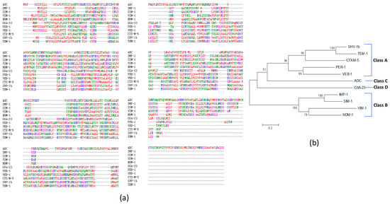 Multiple protein sequence alignment and phylogenetic tree analysis of 11 representative β-lactamases. (a) Multiple sequence alignment using Clustal Omega. Different colors indicate the following: red: residue AVFPMILW; blue: residue DE; magenta: residue RK; green: residue STYHCNGQ; grey: others. The sign “–“(dash) means no amino acid aligned; (b) Phylogenetic tree analysis of these 11 β-lactamases. MEGA 6.0 Neighbor-Joining method with 500 bootstraps and standard settings was applied. The tree is drawn to scale. Branch lengths are in the same units as those of the evolutionary distances used to infer the phylogenetic tree. The numbers shown in the tree are the percentages of replicate trees in which the associated taxa clustered together in the bootstrap test (500 replicates).