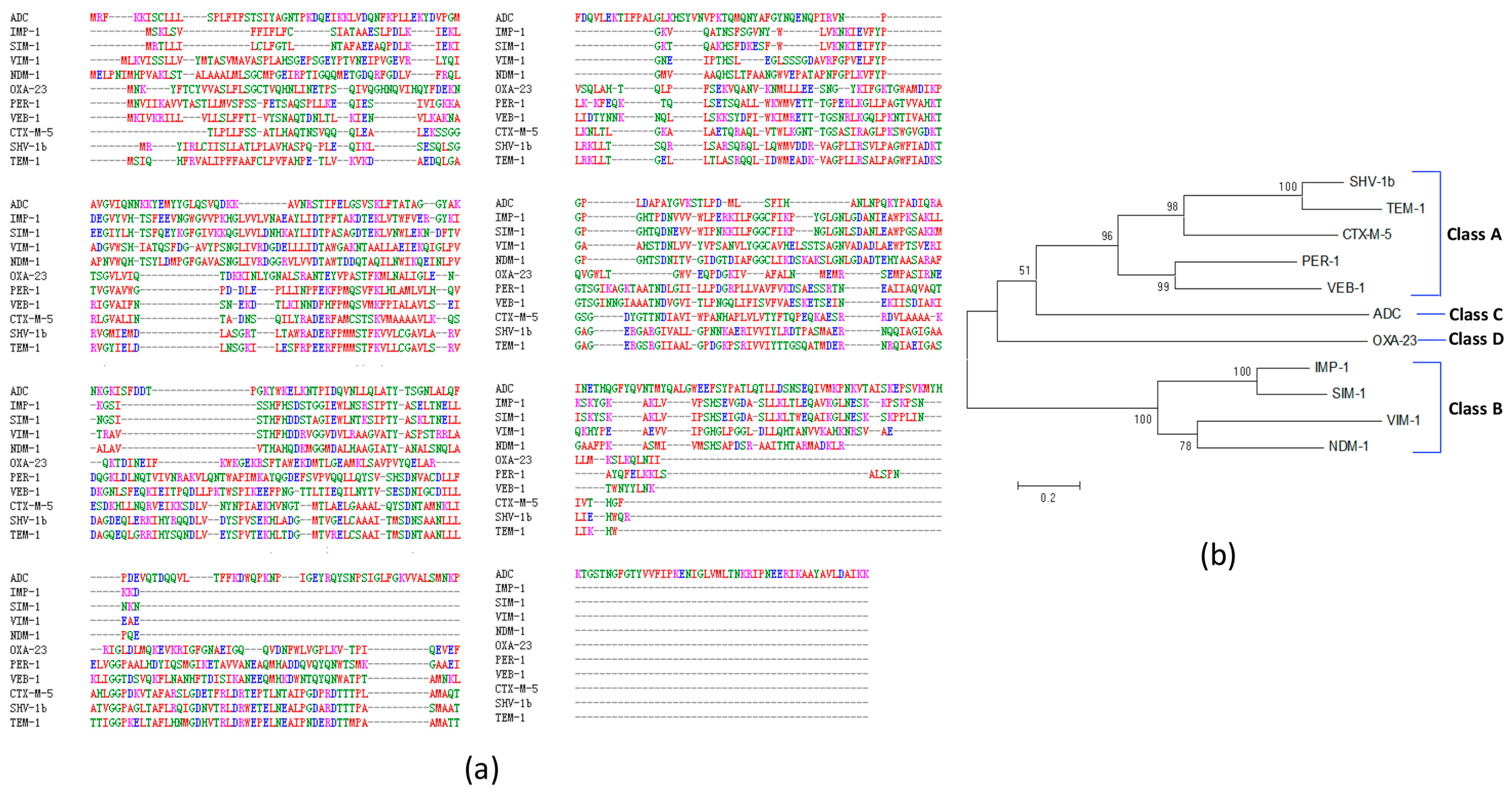 Our further multiple sequence alignment identified many sequence gaps exist among 11 representative β-lactamases (Figure 2a). The protein sequence identity among these 11 β-lactamases ranges from 11.64% to 66.26%, indicating significant sequence variations among β-lactamases. Among Ambler class A β-lactamases (TEM, SHV, CTX-M, PER and VEB), TEM-1 shares extensive similarity with SHV-1 β-lactamases (65.49%). The amino acid sequence similarities of CTX-M-5 with TEM-1 and SHV-1 are 35.04% and 37.09%, respectively. Among Ambler class B metal β-lactamases (IMP, SIM, VIM and NDM), IMP-1 and SIM-1 share the highest similarity (66.26%). However, Ambler class C (ADC) and Ambler class D (OXA) β-lactamases possess fewer identities with other β-lactamases (<20%).