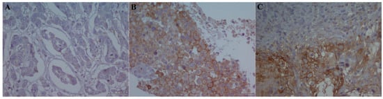 PD-L1 immunostaining in TNBC cells: (A) “Score 0”, detail of absence of membranous immunoreactivity (magnification 40×); (B) “Score 1”, detail of incomplete membranous positivity with basolateral and/or with semicircular bars (magnification 40×); and (C) “Score 2”, detail of complete membranous positivity (magnification 40×).