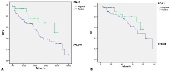 Regarding the relation with patient survival, we showed that tumor PD-L1 expression is strongly associated with better disease-free survival (DFS). A strong statistical association between PD-L1 + TNBC and DFS was present (p = 0.040) (Figure 3A). However, the statistical association with overall survival (OS) are not significant (p = 0.224) (Figure 3B).