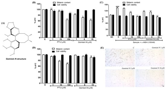 Schisandra chinensis, also known as northern fine-flavor berry, is naturally found in northeastern China, far-east Russia, Japan, and Korea []. This plant has long been used for the treatment of night blindness, skin burn, aseptic inflammation, and liver diseases in traditional oriental medicine [,]. S. chinensis fruit extract and its lignan compounds have been shown to possess various pharmacological effects in murine cell lines. For example, schisandrin A and C have anti-oxidative effects, while schisandrin B has anti-fibrotic, anti-inflammatory, anti-oxidant, and anti-apoptotic activities []. Another lignan compound Gomisin N (Figure 1A) has been reported to suppress oxidative stress-induced apoptosis by inhibiting the release of cytochrome C from mitochondria to the cytoplasm, the cleavage of caspase 3 and PARP, and Ca2+-induced mitochondrial permeability transition in H9c2 rat cardiomyocytes [,]. Interestingly, several studies using mouse models and human skin cell lines have revealed the therapeutic potential of S. chinensis for treating skin disorders. Lee et al. reported that the methanol extract of S. chinensis fruit alleviated contact dermatitis symptoms by reducing the production of pro-inflammatory cytokines such as TNF-α and IFN-γ when topically applied [,]. Kang et al. showed that Schisandra fructus water extract inhibited IκB activation, thereby suppressing the production of TNF-α, IL-6, and GM-CSF in the human mast cell line HMC-1 []. These findings led us to postulate that S. chinensis lignans might affect skin cell functions more broadly. In this study, we sought to investigate the putative roles of Gomisin N, one of the major lignan compounds in S. chinensis, in regulating melanogenesis, thereby evaluating its potential use as a cosmeceutical agent. Here, we report that Gomisin N inhibits melanin biosynthesis without cellular toxicity in human and mouse cells, as well as in zebrafish embryos.
