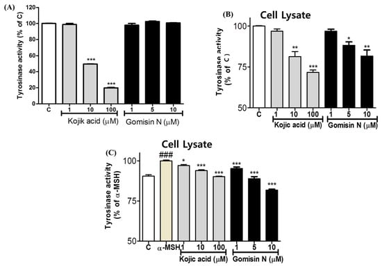 Effects of Gomisin N on mushroom tyrosinase activity. The effect of Gomisin N treatment (1, 5, 10 µM) on mushroom tyrosinase activity was measured using Gomisin N compound (A) and cell lysates from Gomisin N-treated B16 cells without (B) or with (C) α-MSH stimulus. Kojic acid was used as a positive control. All data are presented as the mean ± SEM of three independent experiments. * p < 0.05, ** p < 0.01, *** p < 0.001, and ### p < 0.001, versus the untreated control.
