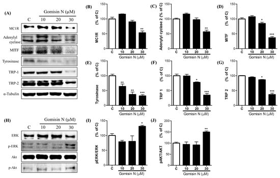 Effects of Gomisin N on the MC1R-mediated melanogenic pathways in Melan-A cells. Melan-A cells were treated with 1, 5, or 10 µM of Gomisin N for 72 h, and then subjected to Western blot analysis. Western blot (A) and densitometric analysis (B–G) for MC1R, adenylyl cyclase 2, MITF, tyrosinase, TRP-1, and TRP-2; Western blot (H) and densitometric analysis (I,J) for ERK, p-ERK, Akt, and p-Akt. α-Tubulin was used as a loading control. All data are presented as the mean ± SEM of three independent experiments. * p < 0.05, ** p < 0.01, and *** p < 0.001 versus the untreated control (C).