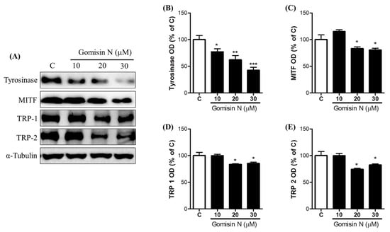 We next aimed to examine whether Gomisin N is effective in inhibiting melanogenesis in vivo. To this end, we treated zebrafish embryos with Gomisin N for 72 h at concentrations of 1, 10, 20, and 30 µM, and then measured expression levels of melanogenic proteins. We observed that Gomisin N treatment inhibited melanin formation in developing zebrafish embryos. Gomisin N-treated embryos showed a reduction in melanin contents in a concentration-dependent manner compared with the untreated control (Figure 4). We also found that the protein levels of tyrosinase, MITF, TRP-1, and TRP-2 were decreased by Gomisin N treatment (Figure 5). These results demonstrate that Gomisin N inhibits melanogenesis in vivo by regulating the transcription factor MITF and its targets tyrosinase, TRP-1, and TRP-2.