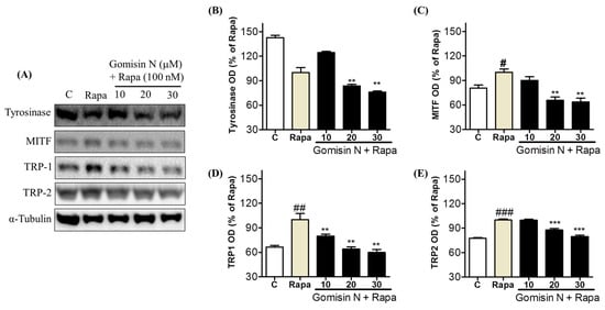 Effects of Gomisin N on the melanogenic pathways in rapamycin-stimulated MNT-1 cells. Protein levels of tyrosinase (A,B), MITF (A,C), TRP-1 (A,D), and TRP-2 (A,E) were measured Western blot analysis in MNT-1 cells after co-treatment with 10, 20, or 30 µM of Gomisin N and 100 nM of rapamycin for 72 h, α-Tubulin was used as a loading control. Densitometric data are presented as the mean ± SEM of three independent experiments. ** p < 0.01, and *** p < 0.001 versus the rapamicin-treated control (Rapa). # p < 0.05, ## p < 0.01, and ### p < 0.001 versus the untreated control (C).