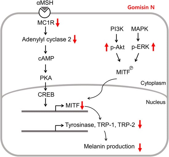 To summarize, this work suggests that Gomisin N may have a high potential as a novel skin-whitening agent. Gomisin N appears to inhibit melanogenesis by repressing the expression of MITF via the MC1R pathway, instead of directly modulating the catalytic activity of tyrosinase and TRPs. Although detailed mechanisms remain to be elucidated, Gomisin N-induced depigmentation is likely to be associated with the activation of the PI3K/Akt and MAPK/ERK pathways (Figure 7).