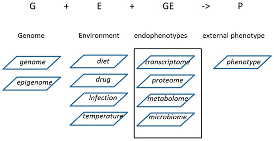 The phenotype of a trait is how the trait is expressed externally: e.g., the amount of milk, the number of eggs, the amount of meat on a carcass. More complex, but still external phenotypes are quality traits, including traits like the composition of the milk (important for consumers, but also for the processing industry), meat quality (taste and health aspects for consumers) and animal health, adaptability, robustness, resilience, etc. Below, we will discuss that all livestock phenotypes are the result of biological processes at various biological levels. The profile of components active at a certain biological level and contributing to the development of the external phenotype constitute phenotypes by themselves, more specifically endogenous phenotypes, or endophenotype [24,25,26], as they are not readily visible from the outside. An endophenotype can be defined as a quantitative biological (sub)trait that is reliable (measurable) and reasonably heritable [27]. A complex trait arises from many genes, i.e., the existence of many genes with variation at the DNA or expression levels, whose individual (internal) components each confer only a small portion to the total (external) phenotype. The best endophenotype candidates (to explain the external phenotype) will also be functionally associated with aspects of the external phenotype.