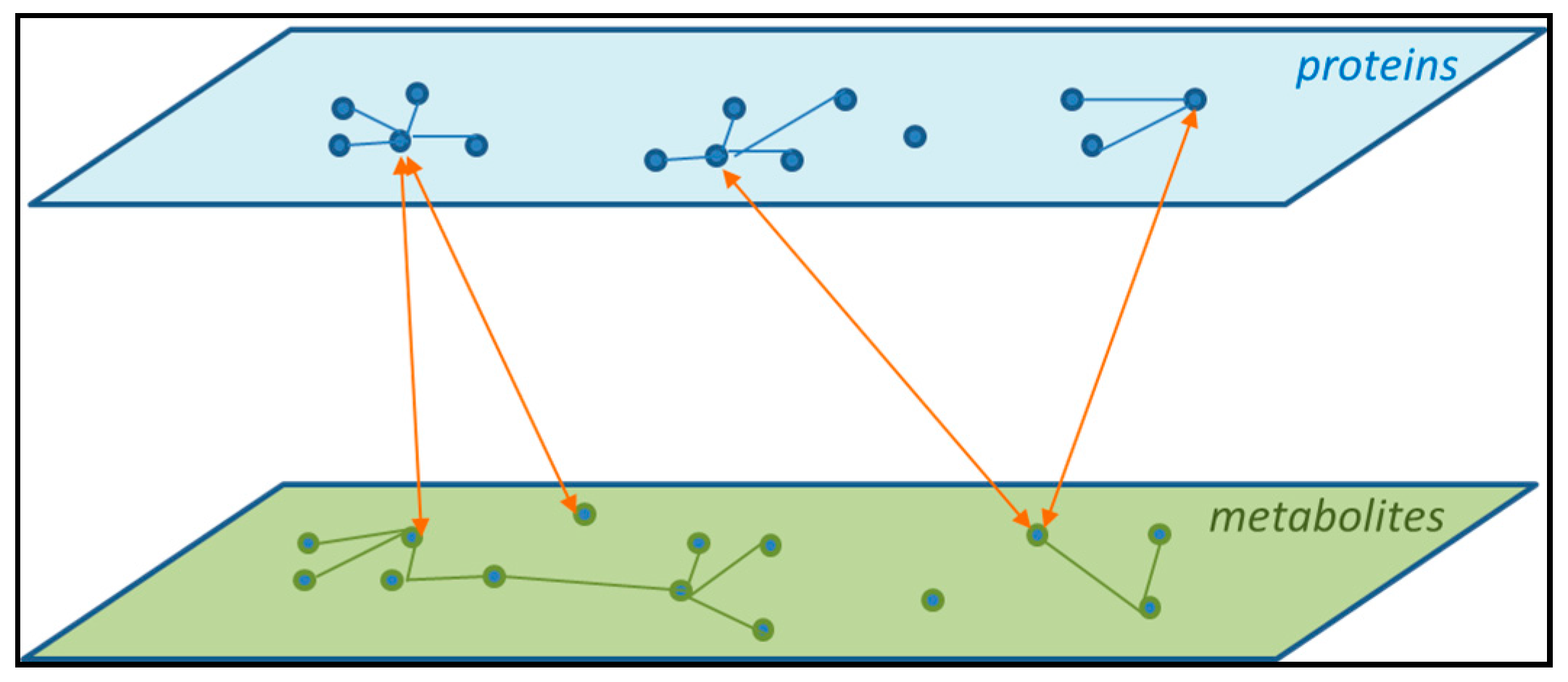 Figure 2 shows an example of two layers of biological information: proteins and metabolites. The figure shows that there are interactions among members within a layer. Within the protein layer, hub proteins showing connections with many other proteins are central in a network. Furthermore, there are direct connections between the two layers. This shows why a (mathematical) model describing the endophenotypes requires one to include all biological levels and include the interactions among them.