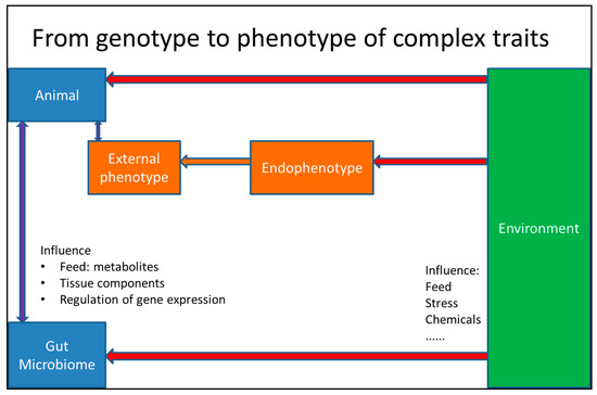 On the skin and all body cavities of animals, a microbiome is living that can affect many aspects of the life of the animal and (co)determine phenotypic traits. In recent years, the gut microbiome has received much attention because it has been recognized that this microbiome is important for (1) the health of the animal; (2) the metabolism of the animal; and (3) the development of tissues and organs of the body of the animal [120,121,122,123,124]. Health, metabolism and development are all complex traits highly important for livestock productivity. The gut microbiome can be regarded as part of the environment, but it also consists of a large number of genomes: the genetic potential of the microbiome is orders of magnitude greater than the genetic potential of its host. Therefore, it can also be argued that the genome of the animal is associated with a variable microbiome, which is partly determined by the animal’s genome. However, it is known that the diet and also the environment greatly affect the composition, diversity and metabolic activity of microbiomes.