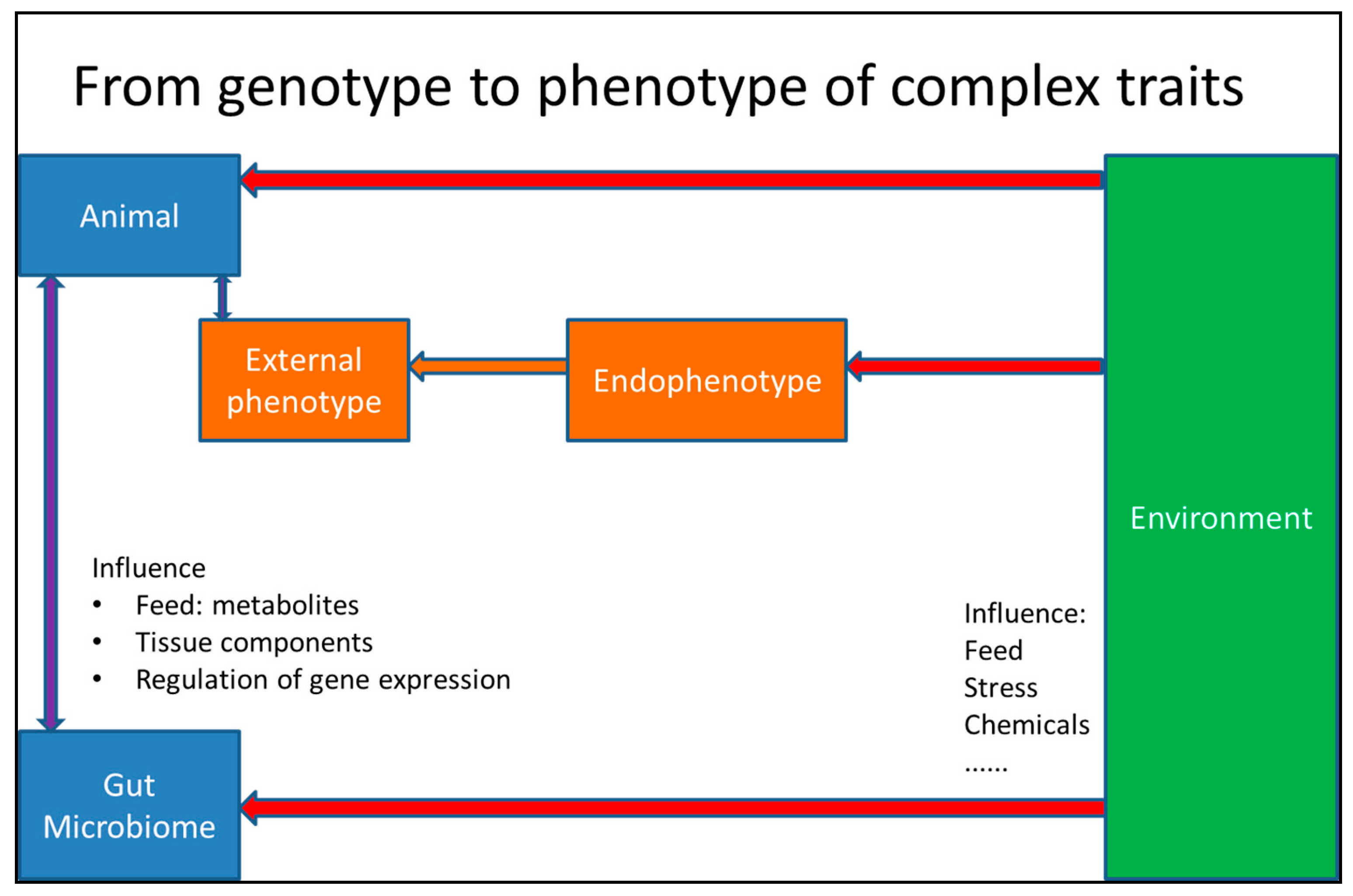 The interactions between the environment, the animal and the gut microbiome; and the direct interactions between the gut microbiome and the animal. The blue boxes represents the genome(s) of the animal. The orange boxes represent the phenotypes of the animal. The green box represents the environment. Red arrows indicate (in) direct effects of the environment. Purple arrows indicate two-way interactions. It should be noted that it is possible to regard the composition and diversity of the microbiome as an endophenotype (in which case, the box should be mixed blue/orange). If we consider this, an additional red arrow from the microbiome box to the endophenotype box should be added.