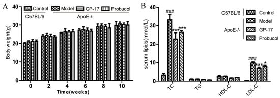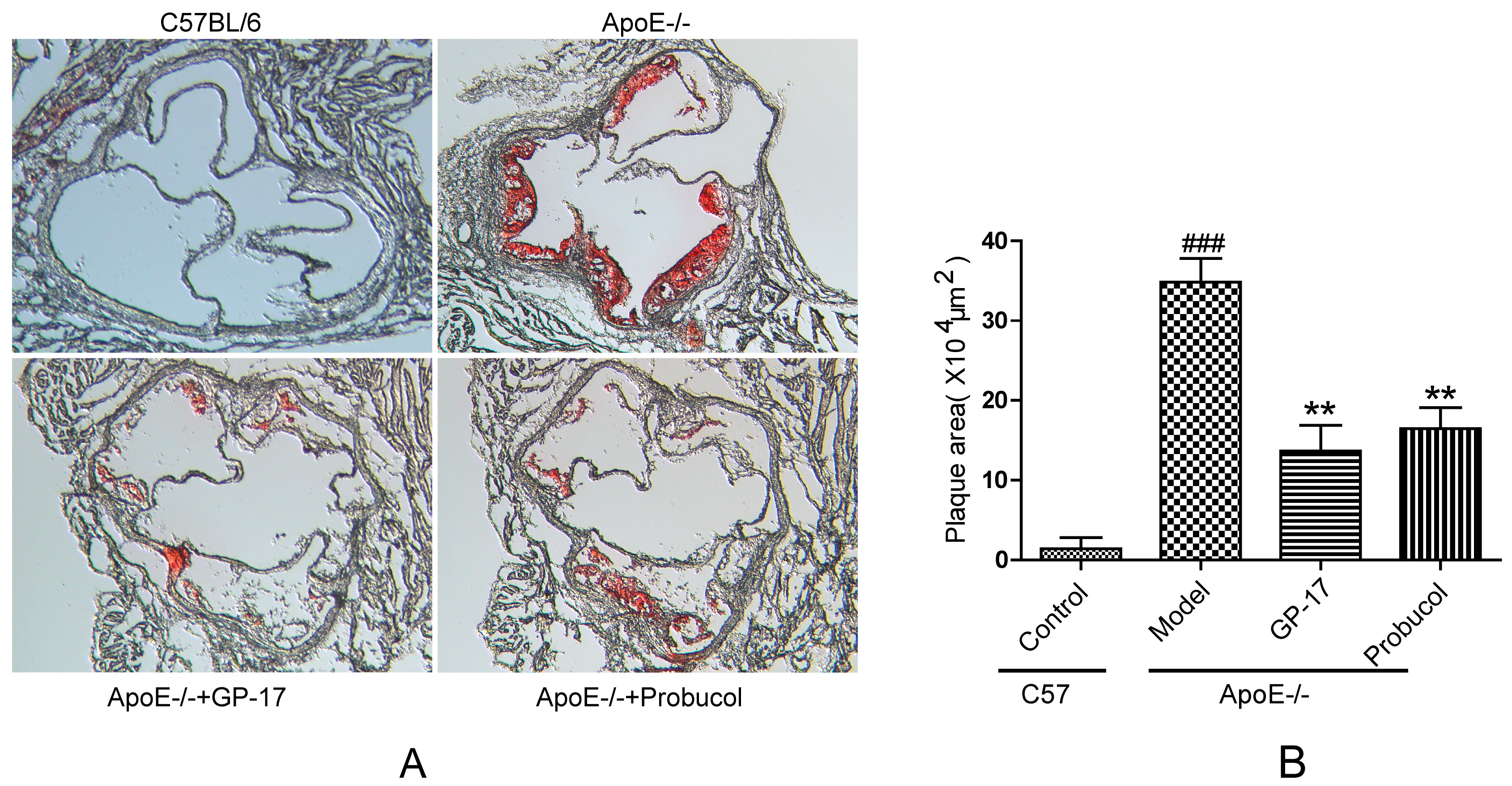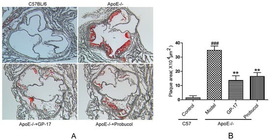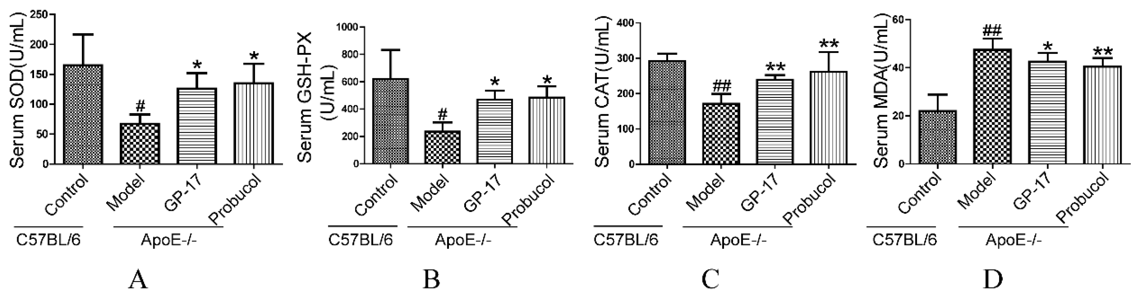 2.1. GP-17 Suppresses Atherosclerotic Development in ApoE−/− Mice