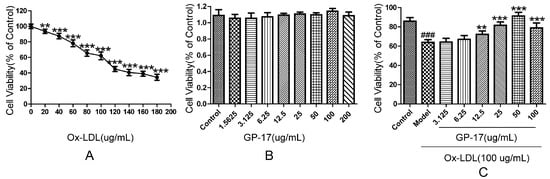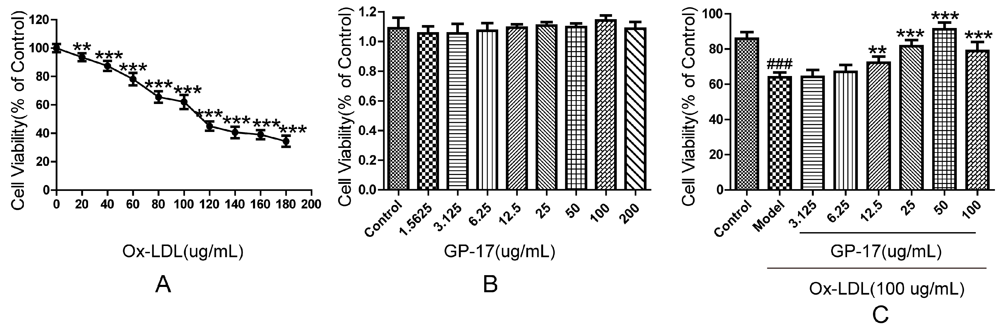 2.3. Protective Effect of GP-17 on Ox-LDL-Induced Cytotoxicity in HUVECs